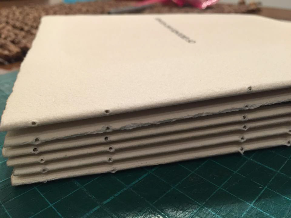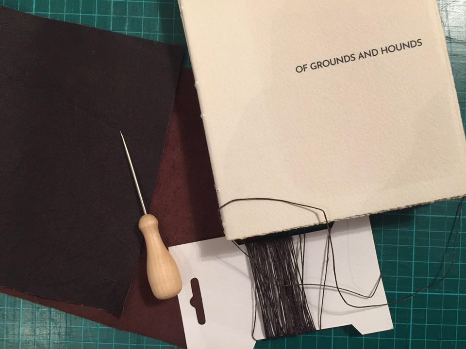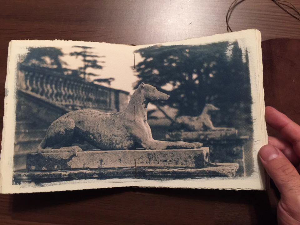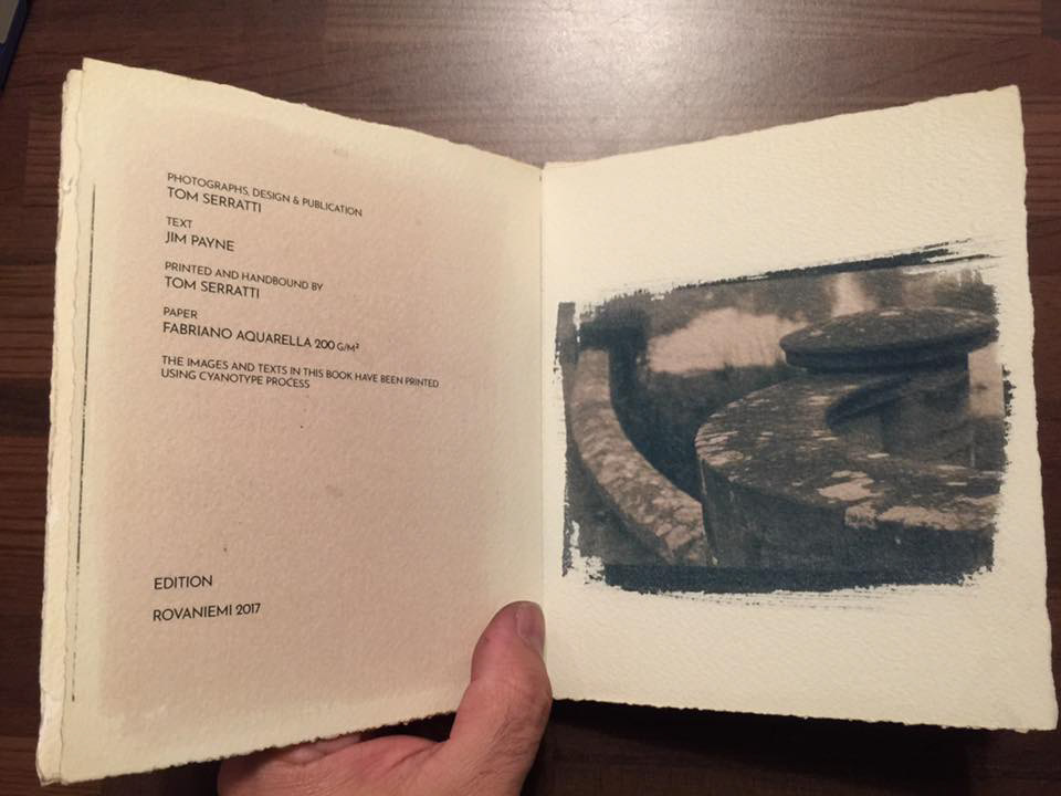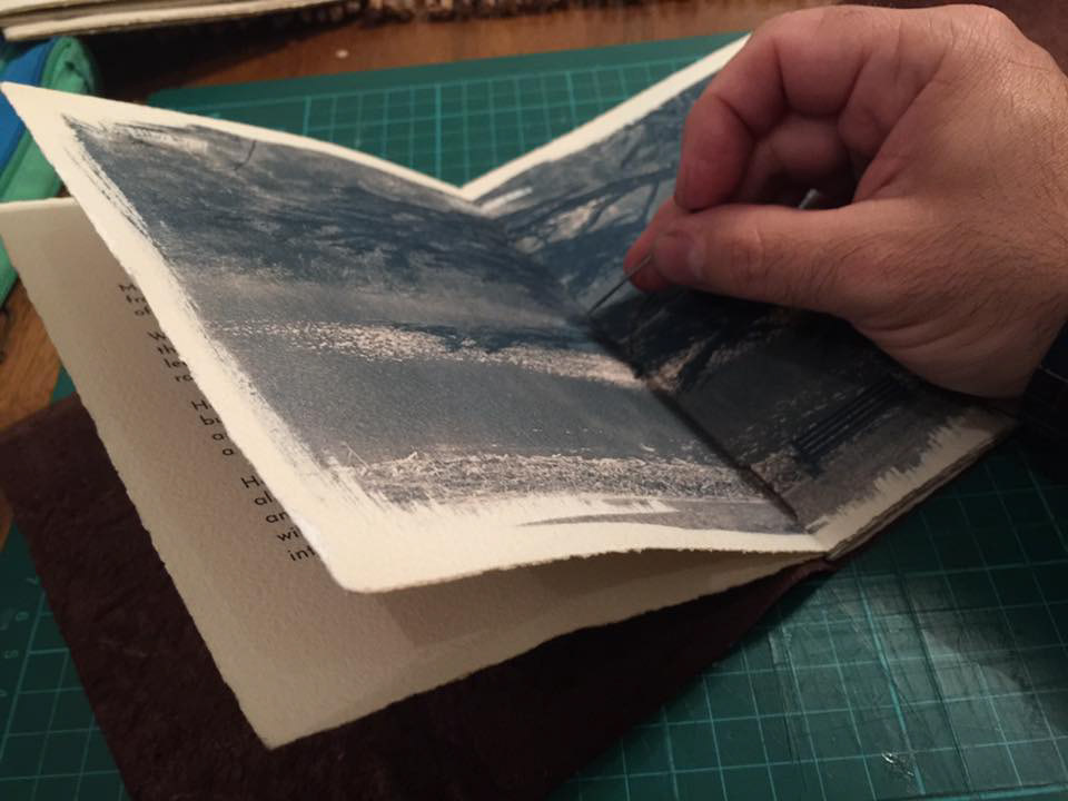 Handbound poem book made using cyanotype photographic process. The images were developed on 100% cotton watercolour paper, and handbound using leather and waxed thread. Poems by Jim Payne and photographs by me. Edition of 2
